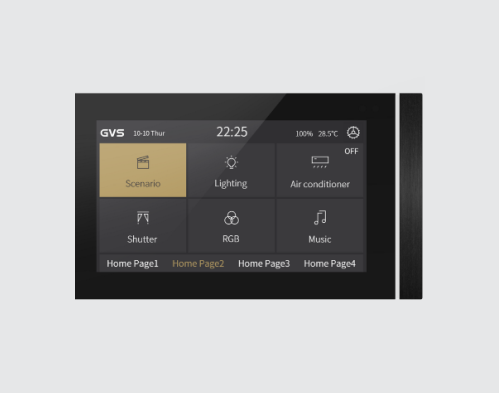 Сенсорная панель IPS 5″ с разрешением 480*854 может устанавливаться как вертикально, так и горизонтально. Алюминиевая декоративная панель, встроенные датчики температуры и приближения. Полный функционал KNX: 15 страниц управления; вкл/выкл и диммирование освещения, управление шторами, кондиционером, теплым полом, вентиляцией, звуком, в том числе по сценариям и расписанию; передача значений различных параметров, RGB, RGBW ,RGBCW, управление цветовой температурой, мониторинг электроэнергии, групповые и логические функции и пр. Возможна кастомизация тем, заставок и символов.