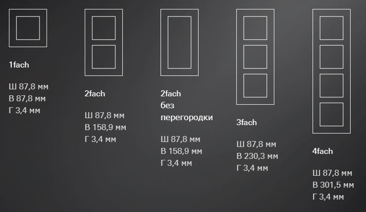 Плоский монтаж: рамки от 1 до 4 постов + двойная рамка без перегородки. Предназначены для вертикальной и горизонтальной установки.