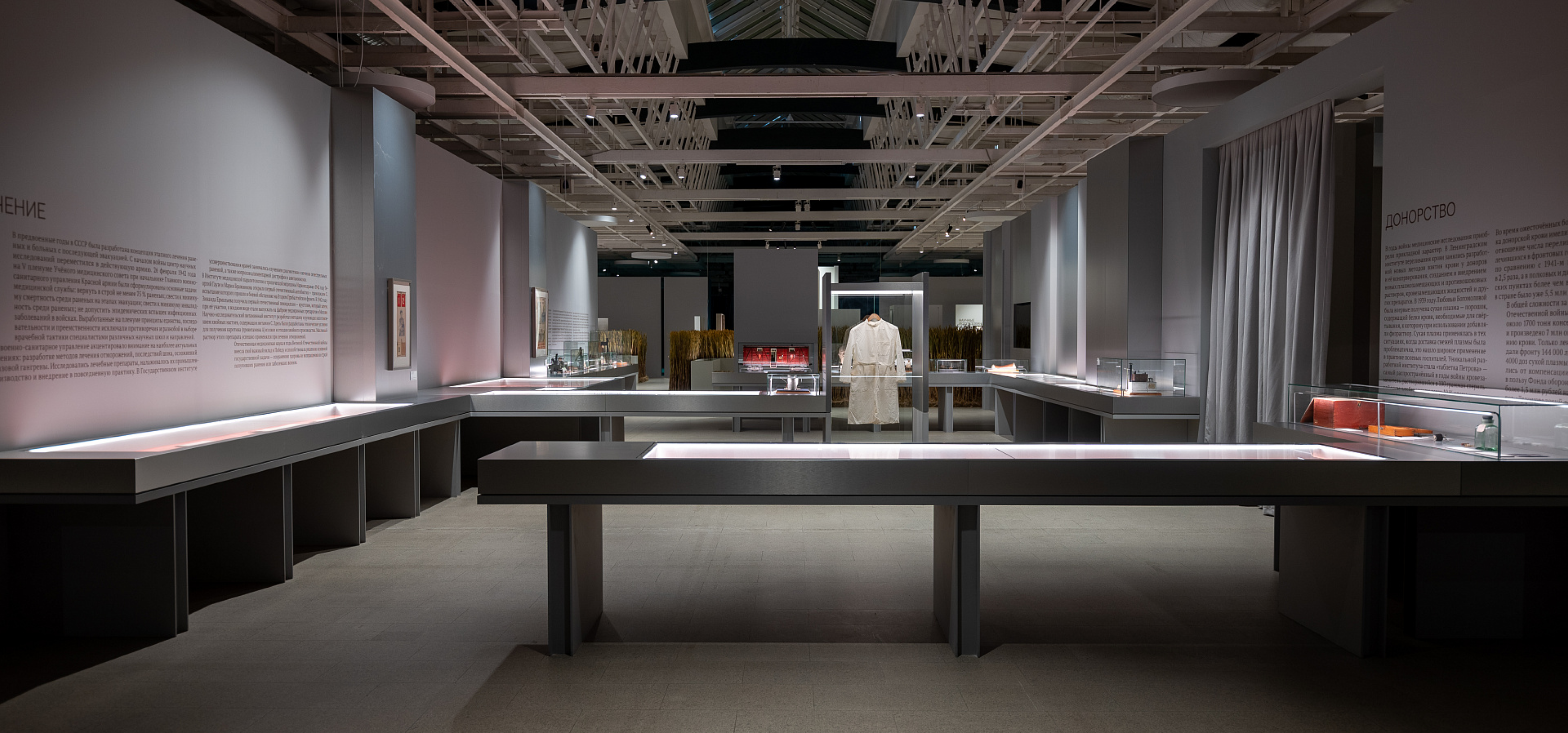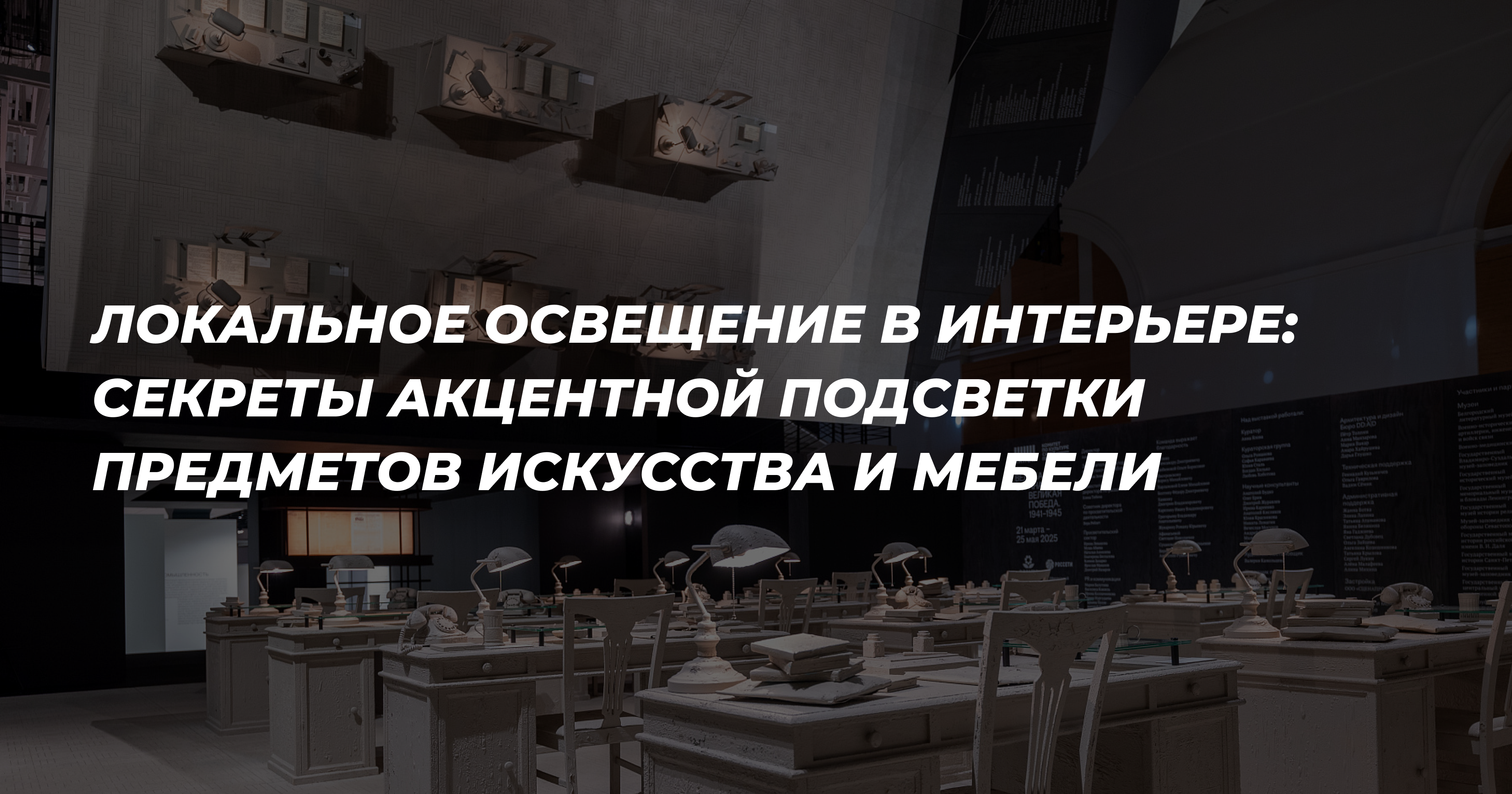 Освещение на выставки подбирается под концепцию экспозиции и музейной эстетики; оформление может требовать строгой нейтральной подачи или, наоборот, художественно выразительного света.