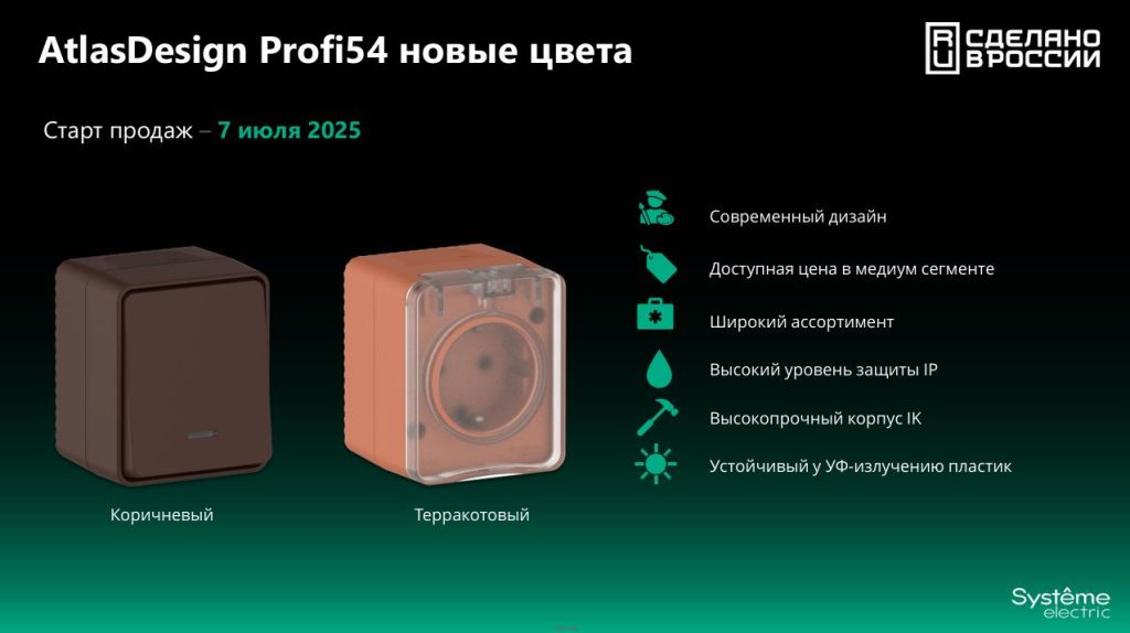 С 07 июля 2025 г. – старт продаж новых цветов КОРИЧНЕВЫЙ И ТЕРРАКОТОВЫЙ в серии AtlasDesign Profi54 от бренда Systeme Electric!