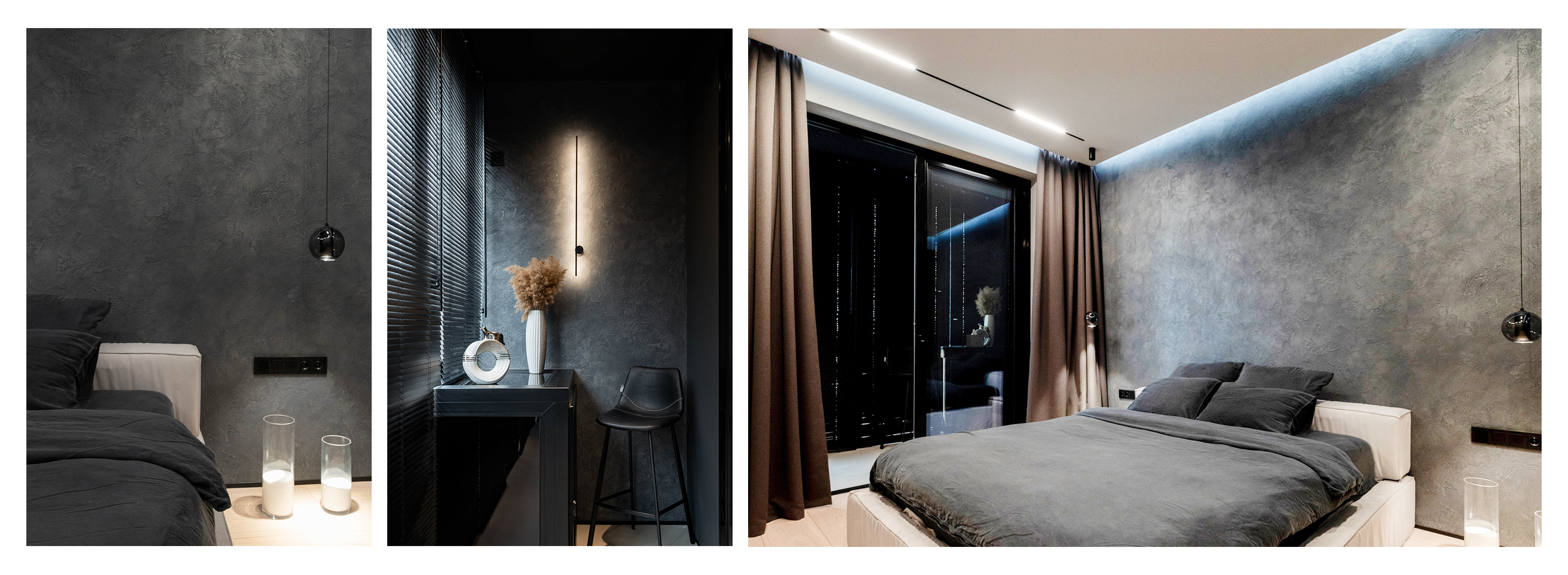 - Зональный свет (акценты и функциональные зоны) – настольные лампы на тумбах у кровати, настенные бра по обеим сторонам кровати (без резкого освещения, направленного в лицо), настенные линейные светильники или направленные светильники на стену над изголовьем. Такие светильники отличаются легкостью настройки атмосферы, а также функцией индивидуальной фиксации возле кровати.