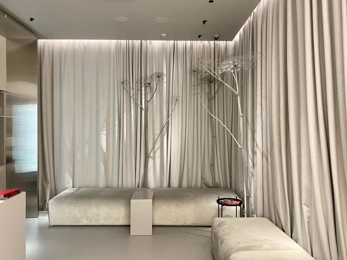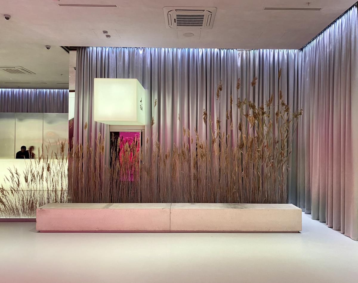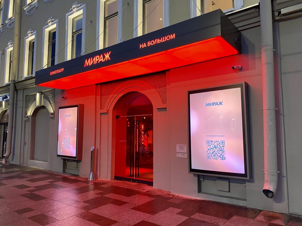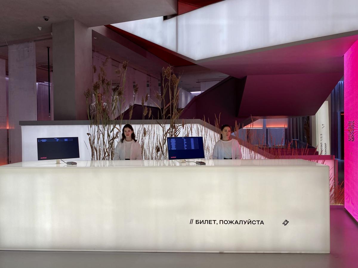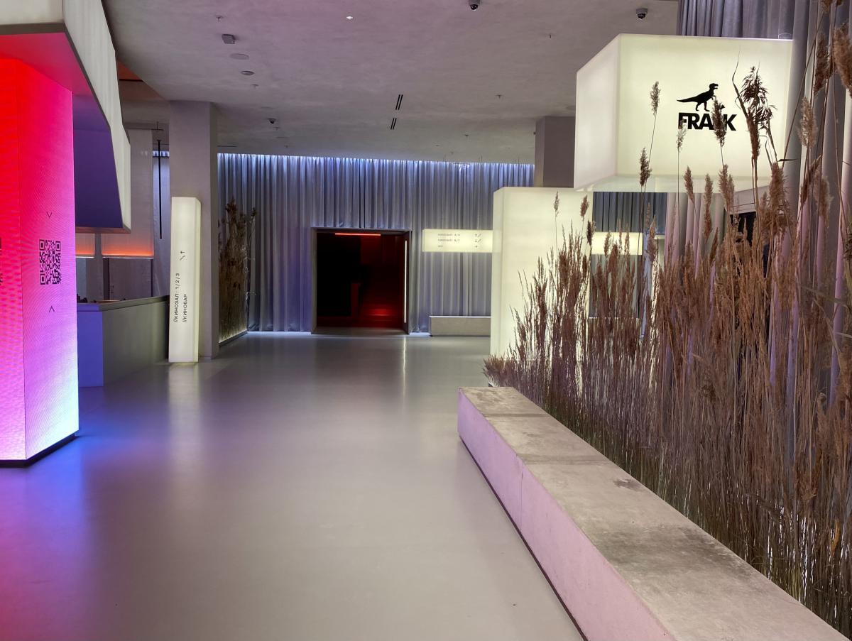 Кинотеатр «Мираж Синема» открыл свои двери для посетителей после реконструкции. Отдельные зоны холла залиты мягким светом, источник которого сложно определить с первого взгляда. Равномерно подсвечиваемые по всей поверхности стойки касс и гардероба, а также лестница и декоративные прямоугольные конструкции смотрятся урбанистически, минималистично, но в то же время уютно благодаря теплому свечению. Сухоцветы также привносят в пространство атмосферу уюта: легкий ненавязчивый акцент на них делается за счет подсветки.