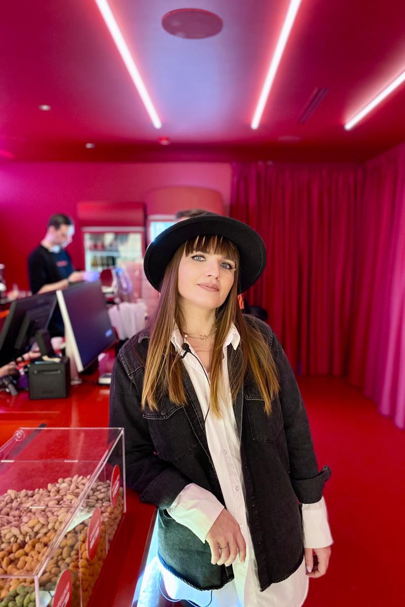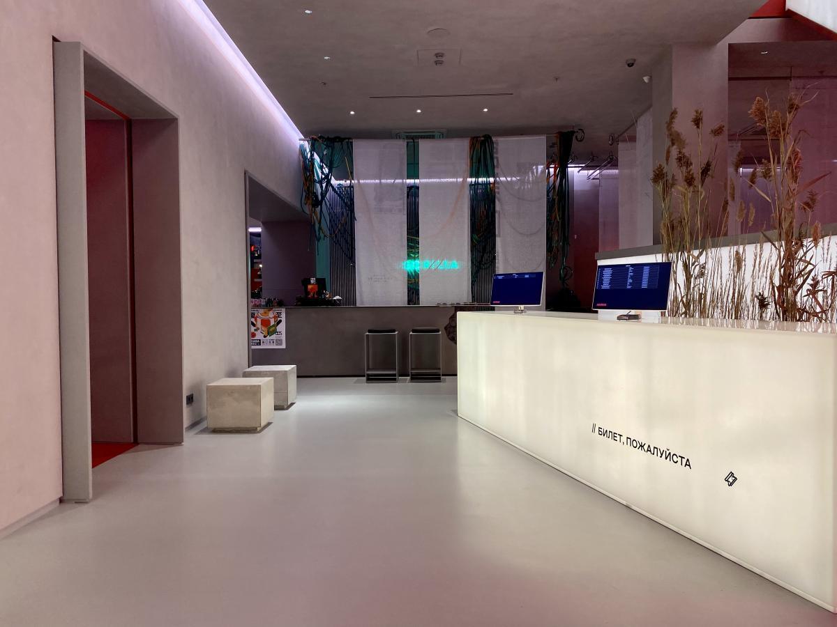 Зона ожидания киносеансов полностью выполнена в красном цвете, на фоне которого белые светящиеся проходы в кинозалы смотрятся стильно и сюрреалистично, отражая дух артхауса.
