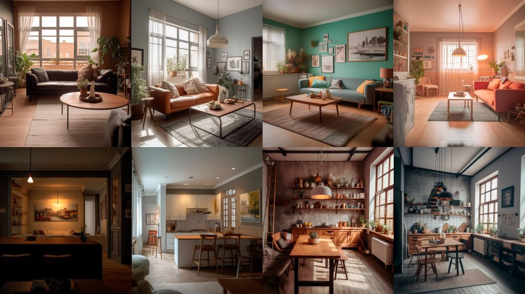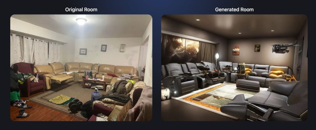 • RoomGPT — сервис для генерации нескольких вариантов дизайна, который позволяет пользователям преобразовывать существующие помещения в соответствии с их предпочтениями и требованиями, его основные функции: генерация дизайнов на основе загруженных фотографий помещений, анализ пространства с учетом размеров, освещения и текущей мебели, визуализация изменений в режиме 2D и базового 3D, поддержка различных стилей интерьера, создание виртуальных туров по обновленному пространству.