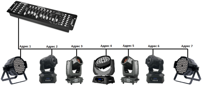 В отличии от аналогового подключения приборов, где к каждому прибору необходимо было тянуть отдельный кабель, в системе DMX512 световые приборы подключаются методом цепочки: из контроллера цифровой сигнал приходит в первый прибор, из первого – во второй, из второго – в третий и тд.